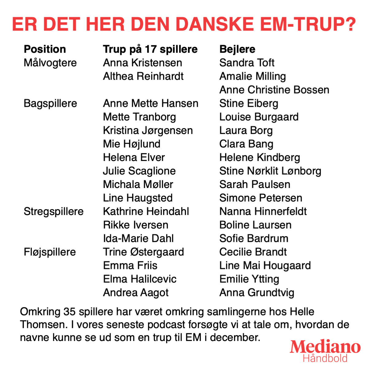 Men vi brugte også lejligheden til at tale om det danske landshold, om EM-lodtrækningen og om den store trup hos Helle Thomsen, der i december skal blive til en slutrundetrup på 16-17 spillere. Vi forsøgte at se et halvt år frem i tiden for at se, hvem der kunne være